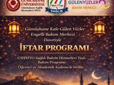 Gümüşhane Kale Gülen Yüzler Engelli Bakım Merkezi’nin davetiyle, Gümüşhane Üniversitesi Sağlık Hizmetleri Meslek Yüksekokulu Sağlık Bakım Hizmetleri Bölümü Yaşlı Bakım Programı öğrenci ve akademik kadrosunun katılımıyla iftar programı gerçekleştirilecektir.